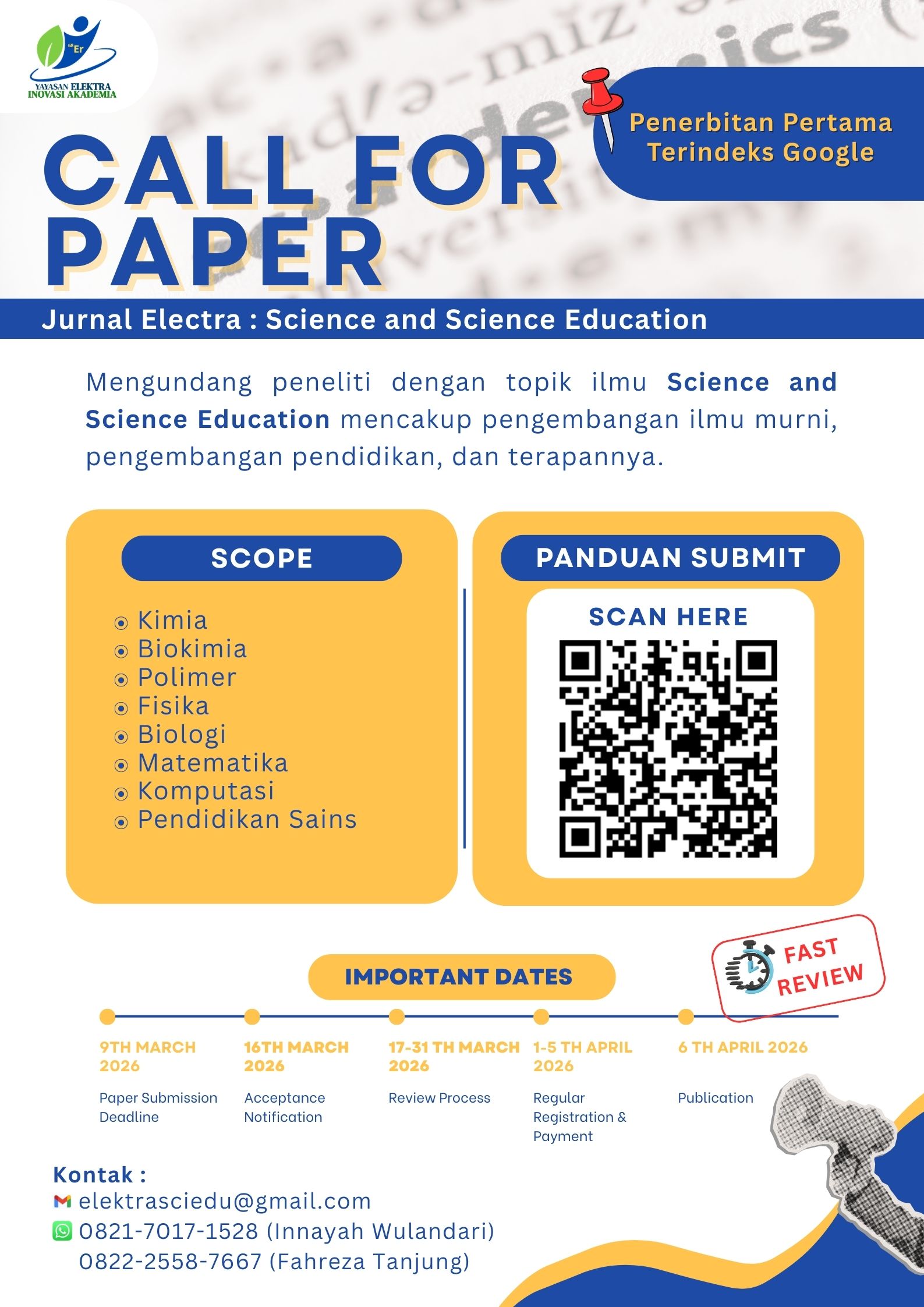 The scope of this journal covers scientific fields such as physics, chemistry, biology, mathematics, as well as research related to learning innovation, learning methods and media, curriculum development, and the integration of technology in science education. Through this publication, the Electra: Journal Science and Science Education hopes to become a platform for researchers, academics, and education practitioners to share their research results and contribute to the development of science and science education.